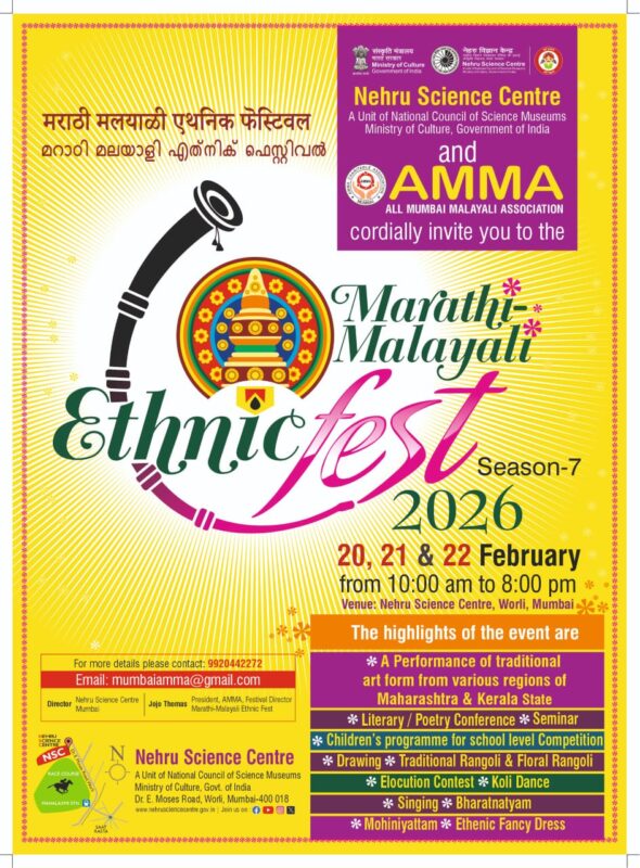​മുംബൈ: കേരളത്തിന്റെയും മഹാരാഷ്ട്രയുടെയും തനത് കലകളും സാംസ്കാരിക പൈതൃകവും കോർത്തിണക്കി സംഘടിപ്പിക്കുന്ന ‘മറാഠി-മലയാളി എത്ത്‌നിക് ഫെസ്റ്റ്’ ഏഴാം സീസണിന് നാളെ (വെള്ളി) വർളിയിലെ നെഹ്‌റു സയൻസ് സെന്ററിൽ തുടക്കമാകും. കേന്ദ്ര സാംസ്കാരിക മന്ത്രാലയത്തിന് കീഴിലുള്ള നെഹ്‌റു സയൻസ് സെന്ററും മുംബൈയിലെ പ്രമുഖ സാംസ്കാരിക സംഘടനയായ ‘അമ്മ’ (ഓൾ മുംബൈ മലയാളി അസോസിയേഷൻ)യും സംയുക്തമായാണ് മൂന്ന് ദിവസം നീണ്ടുനിൽക്കുന്ന ഈ സാംസ്കാരിക മഹാമഹം സംഘടിപ്പിക്കുന്നത്.