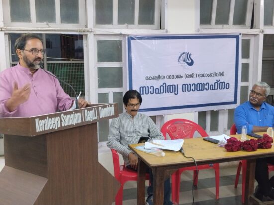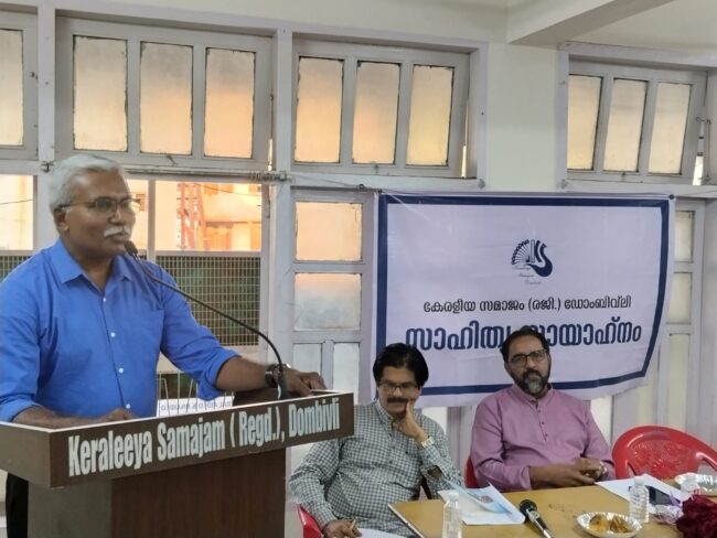 താനെ : ഡോംബിവിലി കേരളീയ സമാജം സംഘടിപ്പിച്ച സാഹിത്യസായാഹ്നത്തിൽ മുതിർന്ന ചെറുകഥാകൃത്തും സാംസ്കാരിക പ്രവർത്തകനുമായ സുരേഷ് വർമ്മ ‘എന്റെ കഥയും കാലവും’ എന്ന വിഷയത്തിൽ മുഖ്യപ്രഭാഷണം നടത്തി. റെയിൽവേ സേവനത്തിലെ മൂന്ന് പതിറ്റാണ്ടിലധികം നീണ്ട അനുഭവങ്ങളും നാലു പതിറ്റാണ്ടോളം മഹാനഗരജീവിതത്തിൽ കണ്ട വൈവിധ്യങ്ങളും വൈരുദ്ധ്യങ്ങളും തന്നെയാണ് തന്റെ കഥകൾക്ക് പ്രചോദനമായതെന്ന് അദ്ദേഹം പറഞ്ഞു. തന്റെ കഥകൾക്ക് പിന്നിലെ ജീവിതാനുഭവങ്ങളും അദ്ദേഹം പങ്കുവച്ചു.